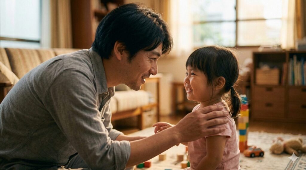 問いかけた後、あえて5秒待つ。彼女が言葉を紡ぎ出すための「余白」をパパが作る。 - 否定せず、正しい音で「上書き」