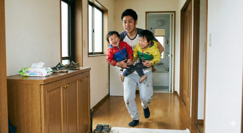 - 理由: 遊び終わった双子を「お風呂特急だよ〜!」と脱衣所へ誘導し、そのまま全ての汚れ(花粉)を洗い流してしまいます。