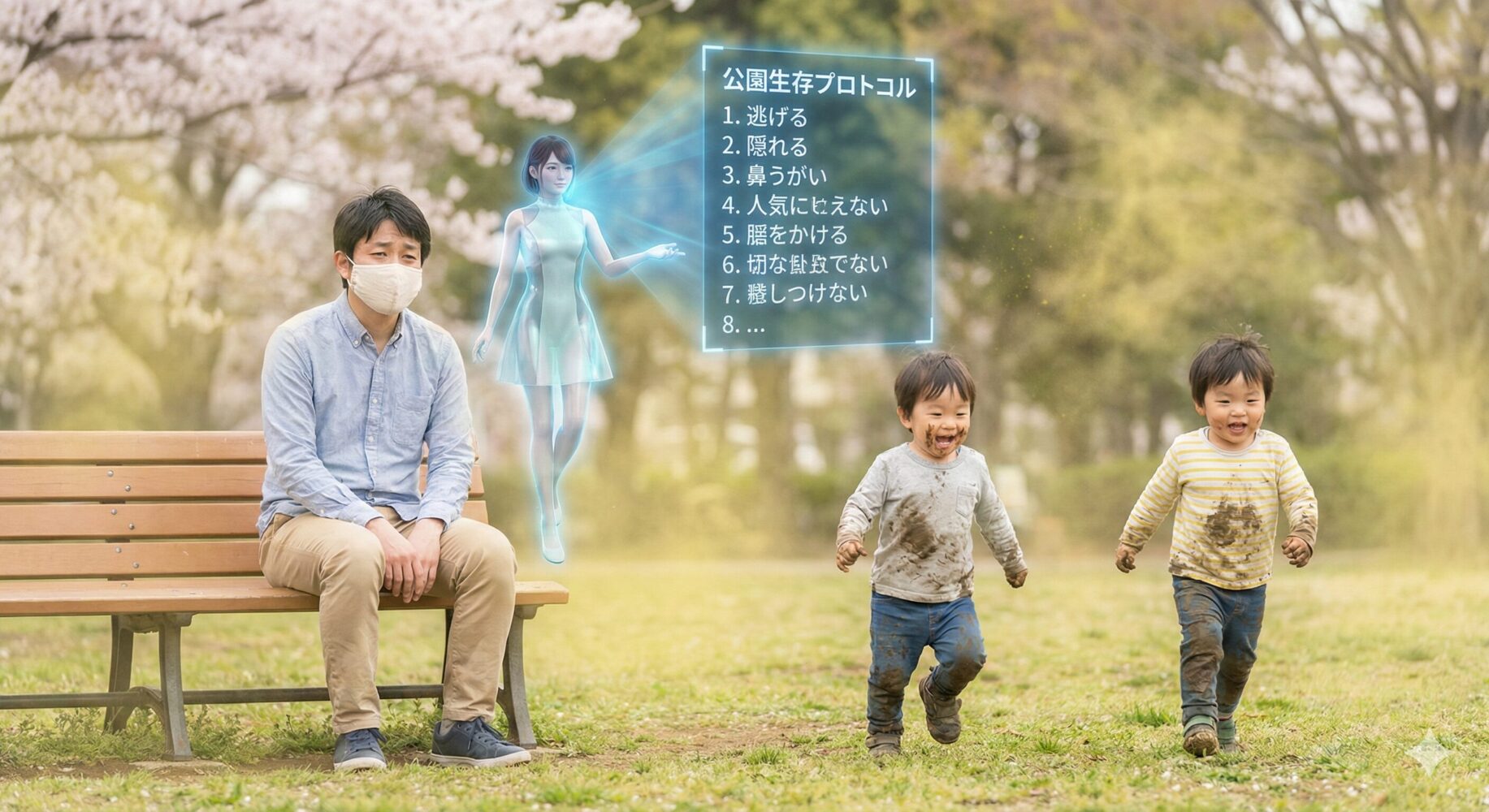 - 双子パパの今: 子供の安全を守るため、花粉が舞い散る公園の奥地まで一緒についていかなければならない。